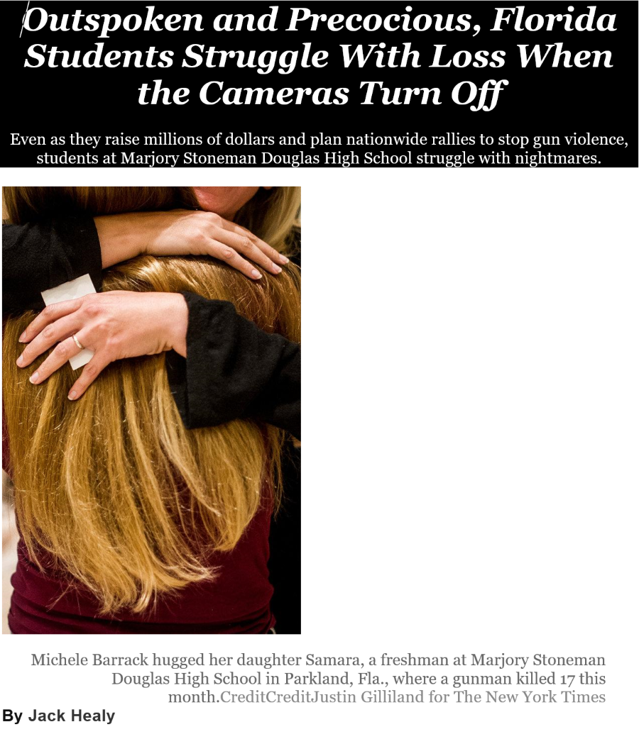 The New York Times 25.2.2018. “Outspoken and precocious, Florida students struggle with loss when the cameras turn off.” https://www.nytimes.com/2018/02/25/us/florida-shooting-parkland-students.html