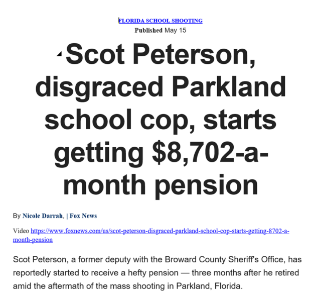 Fox News 15.5.2018. “Scot Peterson, disgraced Parkland school cop, starts getting $8,702-a-month pension.” https://www.foxnews.com/us/scot-peterson-disgraced-parkland-school-cop-starts-getting-8702-a-month-pension