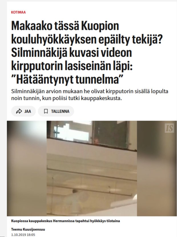 Ilta-Sanomat (I-S) 1.10.2019. “Makaako tässä Kuopion kouluhyökkäyksen epäilty tekijä? Silminnäkijä kuvasi videon kirpputorin lasiseinän läpi: ”Hätääntynyt tunnelma.” https://www.is.fi/kotimaa/art-2000006257932.html
