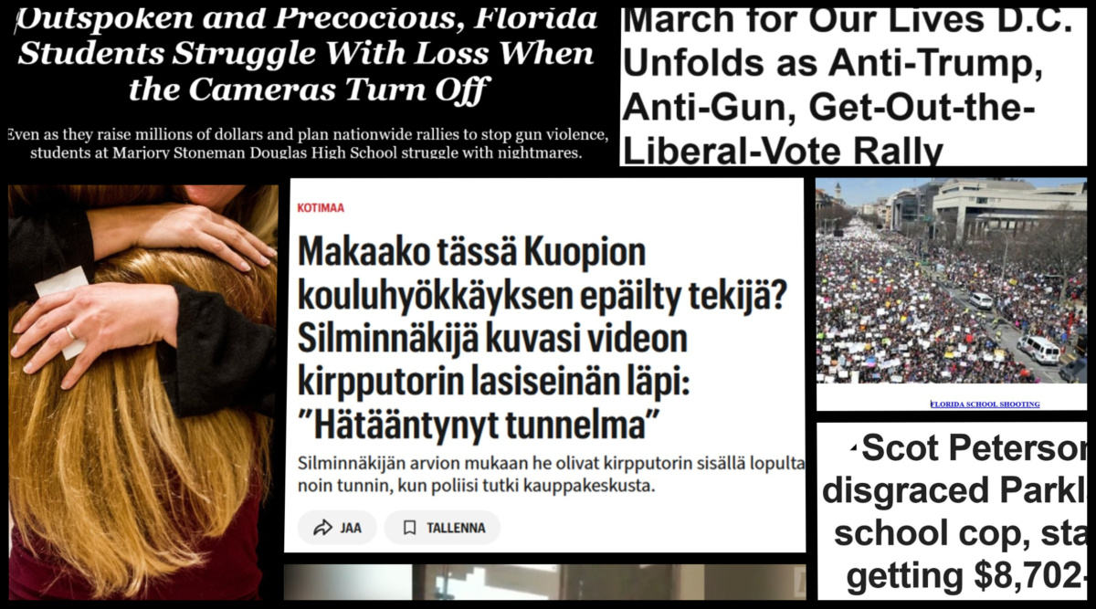 Media-aineisto Parklandin kouluampumisen ja Kuopion kouluhyökkäyksen uutisoinnista
