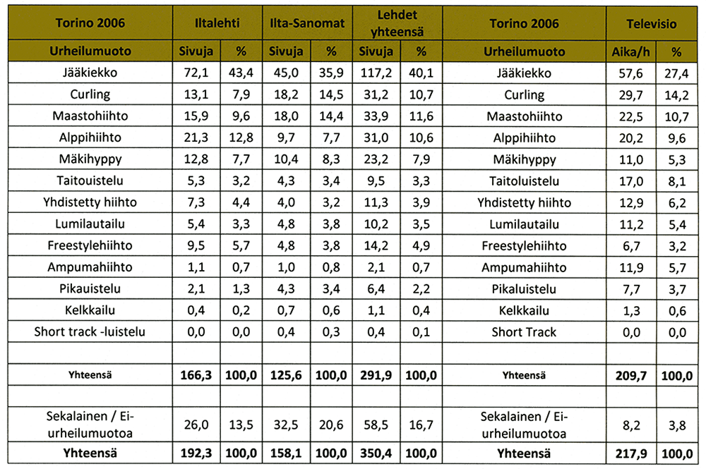 Iltalehti, Ilta-Sanomat, YLE1, YLE2, MTV3 ja Nelonen ajalta 12.8.–31.8.2004 (Ateena) ja 8.2.–28.2.2006 (Torino).