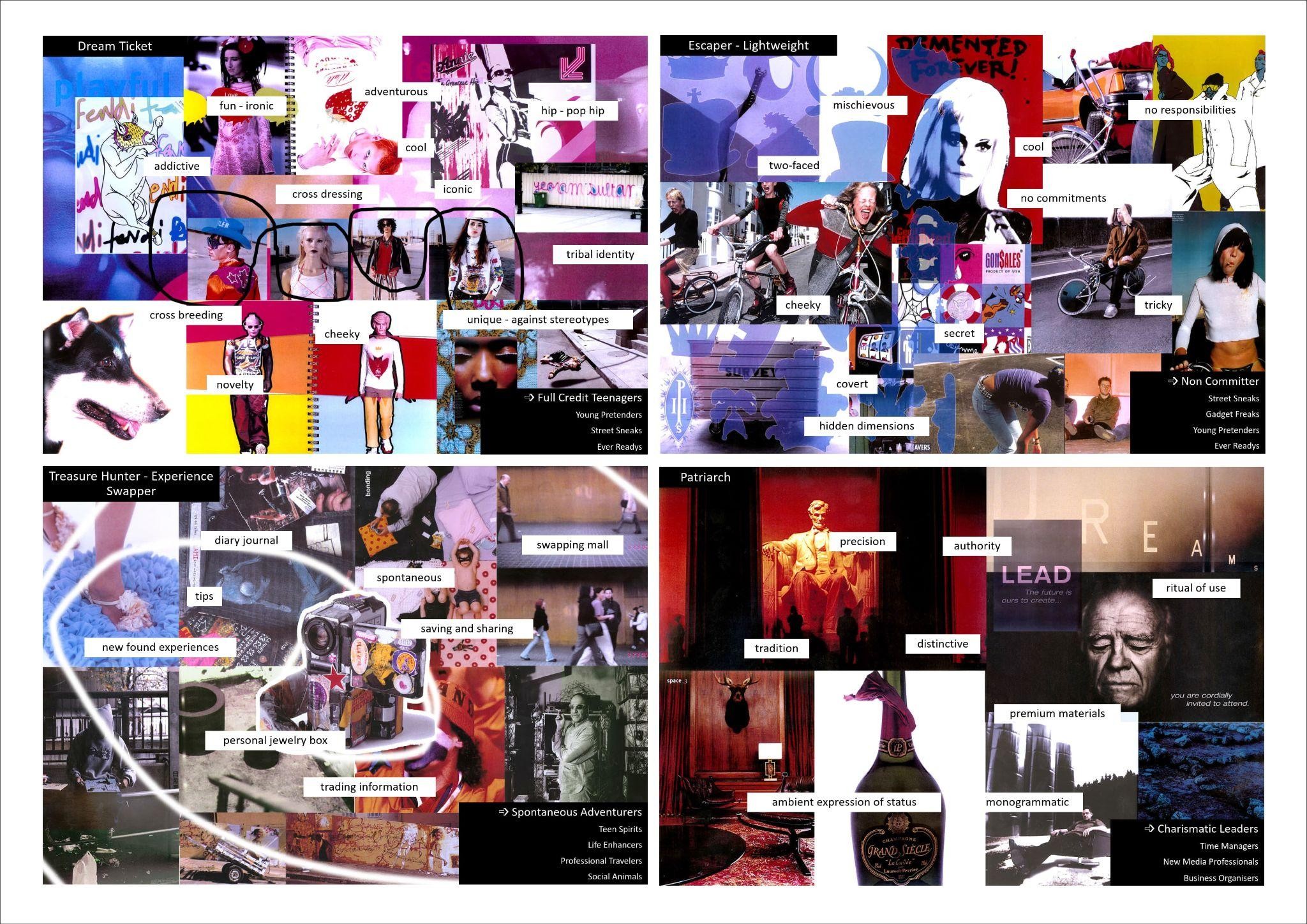 In Fashion – What Is It?, another internal presentation created around 2000, the importance of fashion for Nokia’s design strategy is even more evident. The company acknowledged fashion could be manifested not only in the designed object but also in its media imagery (Nokia Corporation n.d.a.). Design strategy presentations around the same period showcase the company’s efforts in crafting their public image through fashion magazines like BAZAAR and Vogue (Nokia Corporation 1996–1999). For Nokia (n.d.a), fashion was defined as ”a hybrid of commodity and fantasy,” where ’fantasy’ was the most value-adding element in sales. Other than the strategy presentations, numerous moodboards and user segmentation materials reflect the diversity of projected users as conceptualized by Nokia (see Figure 1).