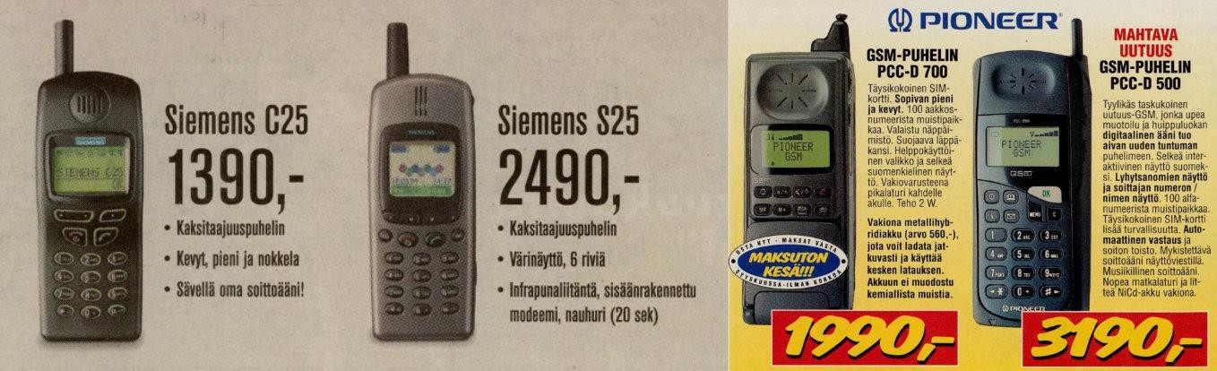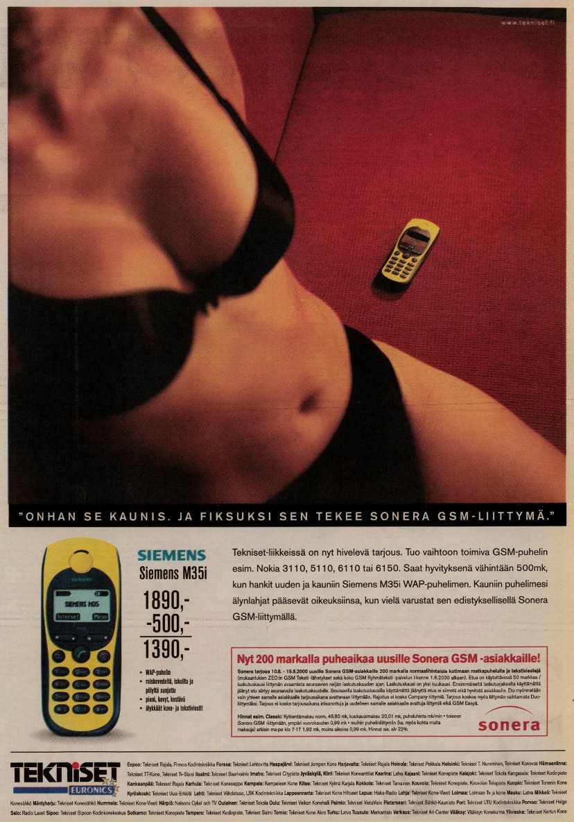Early mobile phone advertising styles were largely uniform and comparable, with an emphasis on the most recent technological breakthroughs, which is well in line with their initial audience. Rather surprisingly, only a few of the advertisements studied for this article mentioned or focused on mobile phones’ visual personalization capabilities, even when the devices had already proliferated in the market. The 1999 Siemens S25 (Figure 12) Sonera advertisement cited the device’s six-row color screen and the Siemens M35i (Figure 15) was marketed as offering even MMS (Multimedia Messaging Service) capabilities, ‘intelligently’, of course. Otherwise, the marketers largely employed identical vocabulary from advertisement to another, with each unique technical detail being intelligent, smart, convenient and straightforward to use.