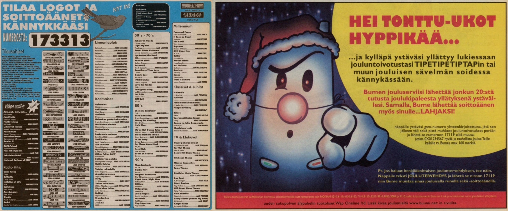 Commercials for purchasing ringtones from various vendors were diverse and often highly detailed, as can be seen in advertisements selling the most popular hit songs of the time or nostalgic tunes from the past. For instance, Figure 14a contains categorized ringtones ranging from classical Sibelius to the theme from Mission: Impossible 2 (2000) and the 1970s’ rock anthem Sweet Home Alabama (1974) by Lynyrd Skynyrd. Ringtones could also be purchased as gifts for friends or even as Christmas greetings, as illustrated by the early 2000s’ and late 1990s’ advertisement (Figures 14a and 14b).