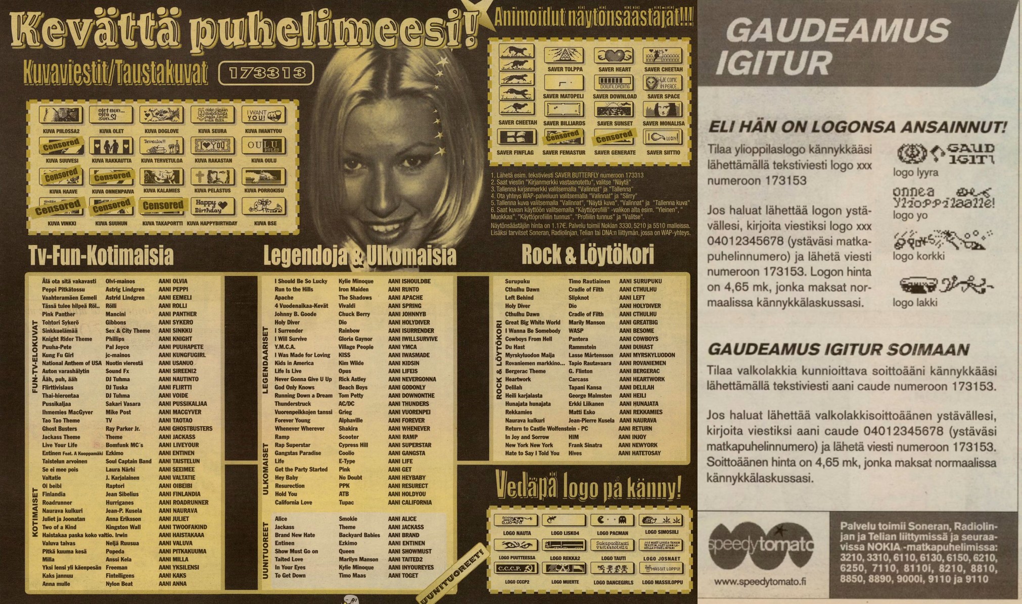 Another advertisement in color (Figure 14a) marketed logos ranging from animals to band themes and bumpkin humor slogans. On a general level, many of the advertisements appear to be erratic, as the formats, colors, fonts, and layouts differ from one another. However, some of the advertised logo, wallpaper and screensaver topics are similar, with the same band logos, censored R-rated content or slogans. One advertisement (Figure 16b) complimentarily stands out from the others as it promotes purchasing a high school graduation greeting logo for the recent graduate. According to a price comparison published in Iltalehti (Mar 3/2000), logos cost about 3–5 marks, roughly a euro in today’s money – not a small sum, but apparently acceptable to the audience.
