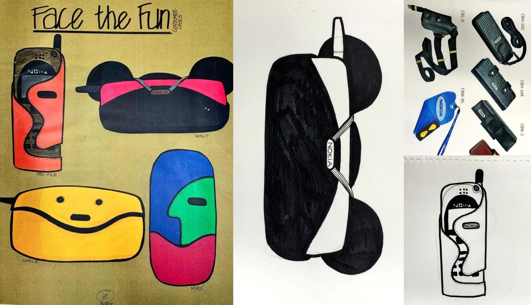 Although most of the cases listed on Nokia’s website in 1996 appeared minimalistic or utilitarian, a series of sketches titled Face the Fun, preserved in the Nokia Design Archive, reflects early exploration in expressive phone case styling (Figure 3). Annotated with the year range 1995–1997, Face the Fun includes a colored illustration presenting four case design concepts, black-and-white drawings of each concept and a clipping of marketing material featuring cases designed for the Nokia 8100 series.
