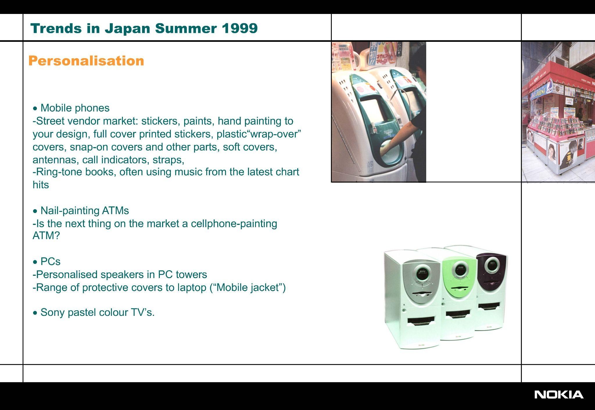 In addition to phone manufacturers and established fashion brands, several other vendors provided products and services for external personalization. Trends in Japan Summer 1999 (Nokia Corporation 1999), a trend forecasting presentation, reveals the company’s attention to the influence of street fashion and youth culture in personalizing consumer electronics (see Figure 5). The third page of the presentation summarizes ongoing trends of decorating mobile phones with stickers, paint, straps and different types of covers. The street vendor market in Japan not only sold materials for decoration, but also provided services, such as hand-painting phones according to customers’ designs. Likely because the hand-painting services resembled nail salons, the report also highlighted the newly emerged nail-painting ATMs in Japan and further speculated on the possibility of automated phone-painting machines.