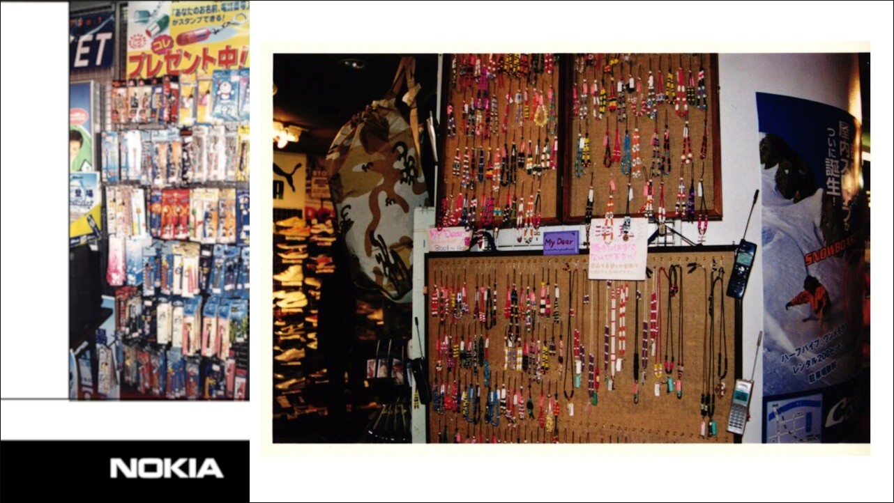 Figure 6b is a photo taken by Nokia’s designer Anna Valtonen in the 1990s, possibly also for the study of Japanese mobile media culture. The image focuses on rows of colorful beaded trinkets hanging on display panels on a wall. Three mobile phones adorned with the trinkets are displayed at the sides of one panel, as examples advertising the accessories. In the background, the image shows a poster of snowboarding gear, a backpack with expressive patterns and a shelf of branded sneakers, hinting that the place might be a sportswear or street style retailer. Selling phone accessories in an apparel store reflects how the practices of personalizing mobile phones had already become part of fashion or lifestyle choices instead of solely about technical utility in the late 1990s of Japan. In addition, these market research materials from Nokia illustrate how designers studied the inscription of fashion in technological objects from different cultures.