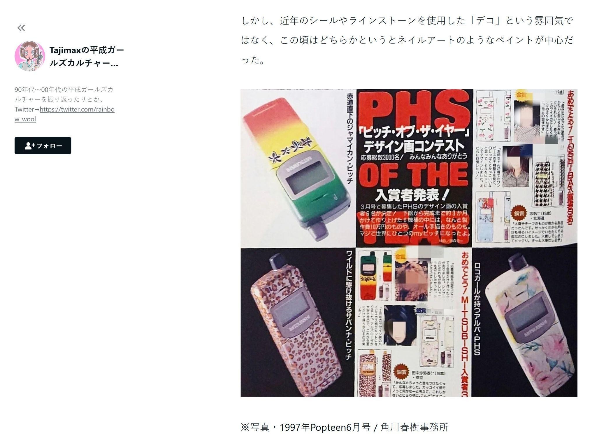 Young consumers’ DIY (do it yourself) culture of personalizing phone appearances exemplifies this accelerated popularization of mobile communications in Japan. In the blog Tajimaxの平成ガールズカルチャー論 [Tajimax’s Theory of Heisei Girls Culture], the blogger Tajimax included a page from the June 1997 issue of teenage magazine Popteen to exemplify the culture of デコ電 [deco-den, meaning ’decorated phones’] in the 1990s. Compared to the previously mentioned examples of Iltalehti and Vogue, Popteen adopted a more interactive approach to engage its audience. In the magazine image, the text indicates that the magazine was announcing the winners of its phone decoration contest named PHS OF THE YEAR. The open call was published in March 1996 and received as many as 3000 submissions.