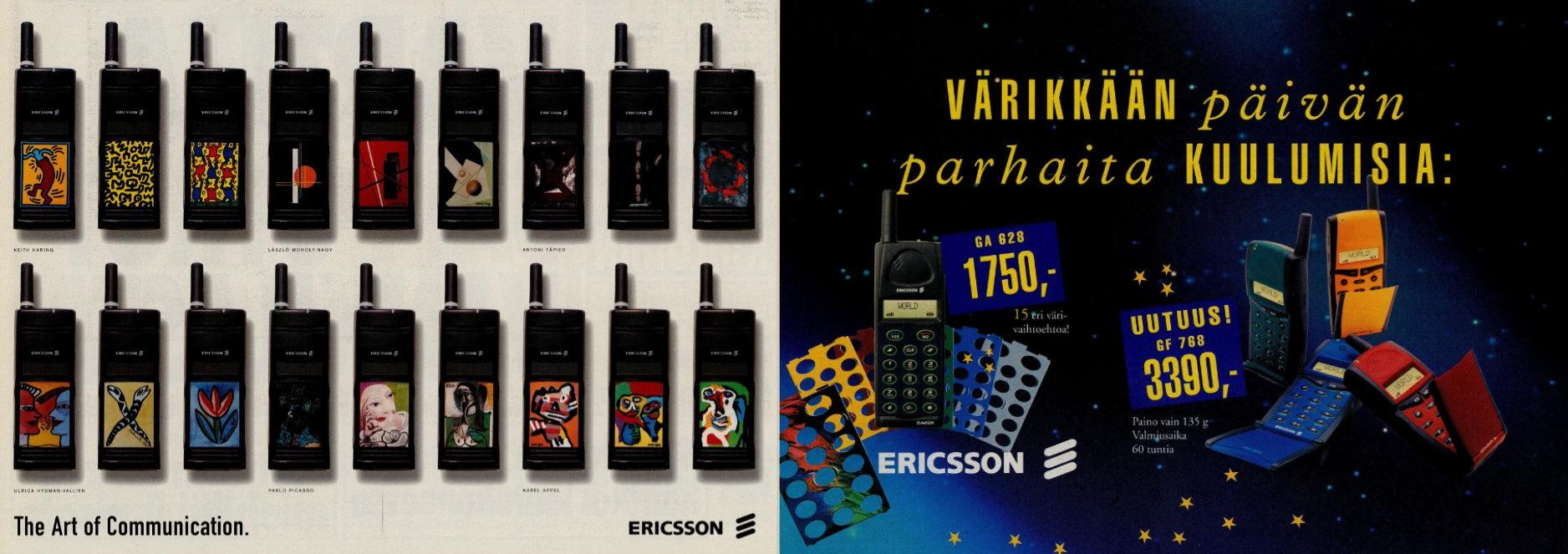 In 1996, Ericsson announced the GA628 model, which included four interchangeable color panels for the keypad area, together with colored rings for the antenna. A thin sheet of plastic was a minimum effort solution to provide color personalization, but it does reveal how the Swedish company, too, tried to avoid falling behind in product development (Figure 8b). An Iltalehti advertisement (Sep 11/1996) mentions the Ericsson GF388, which stood out due to its replaceable keypad cover lid (see Figure 8a): as shown in the advertisement, the lid could be swapped out for several designs featuring artwork by prominent artists, such as Keith Haring, László Moholy-Nagy or Antoni Tàpies – in this case, the projected user was both trendy and cultured. The campaign took a playful tone, referring to the phone’s cover changeability with the phrase “Tomorrow you can have a new puppy. Or three. Or nine,” highlighting the flexible and imaginative nature of the feature.