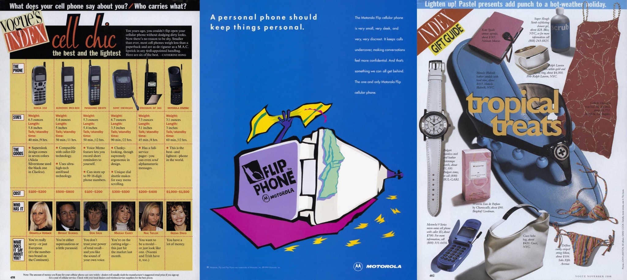 Looking at Vogue and Vanity Fair magazines from the 1990s, mobile phones were described as small, sleek and personal, in line with the fact that they were becoming increasingly compact (Figure 2a). Noting the shift from the large, bulky models of the past and the lightweight new wave, Vogue 3/1996 stated that “ten years ago, you couldn’t flip open your cellular phone without dodging dirty looks,” whereas now you would want to show it off instead (see Figures 2b and 2c). Mobile phones were increasingly portrayed as a prominent part of the handbag, symbolizing both practicality and style. By this time, the diversity of projected users had already expanded far beyond businessmen and professionals.